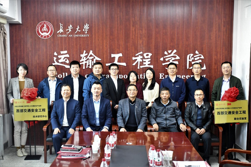 On the afternoon of November 6, the opening ceremony of the Western Traffic Safety Engineering Technology Research Center and Western Traffic Safety Engineering Joint Laboratory jointly constructed by the School of Transportation Engineering and 3M China Co. Ltd. was held in the conference room of the college. 6 representatives including Gu Chaofeng, General Manager of Traffic Safety Product Department of 3M Greater China, Huang Sizhe, Technical Manager, Xue Yanjun, Chairman of Xi’an Xituo Transportation Facilities Company, Li Gaowang, Chairman of Shaanxi High-speed Traffic Industry and Trade Co. LTD, Xi’an Huage Transportation Facilities Engineering Equipment Zhou Yousheng, Chairman of the Co., Ltd., Tian Xinmin, Secretary of the School of Transportation Engineering, Wu Ximei, Deputy Secretary, Wang Jianjun, Deputy Dean, and the head of the institute attended the unveiling ceremony. The ceremony was presided over by Wang Jianjun.