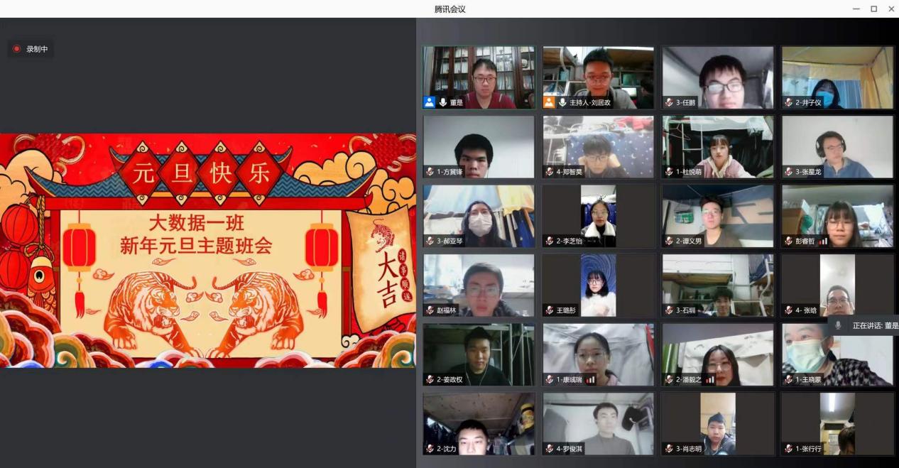 2020级大数据管理与应用一班“共抗疫,迎新年”主题班会在腾讯会议上举行。班长刘居政和团支书彭睿哲担任主持人。