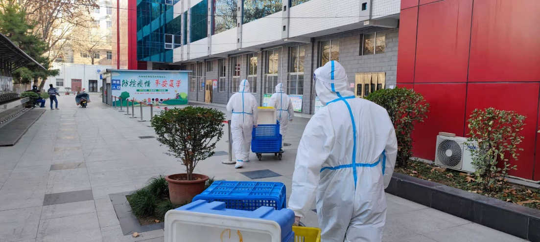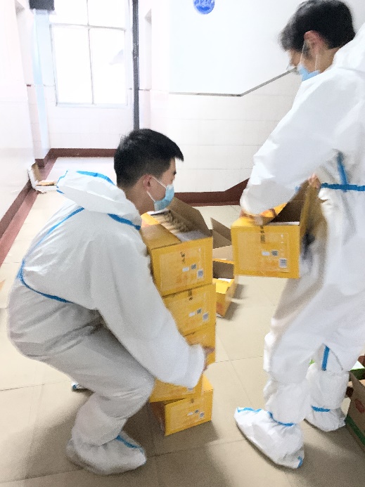 清晨,迎着朝阳而起,伴着第一缕阳光,送餐志愿者们确定好配餐数量及地点,为同学们送上早餐,从食堂到公寓楼来来回回、重复一遍又一遍的运送餐食、分配发放;晌午,一边工作一边在防护服里蒸个“桑拿”;夜深人静也不忘为其他志愿者们备好明天的防疫物资。几天时间内数以万计的餐食,鞋套磨坏了一双又一双,餐车装满了一趟又一趟。他们用奋战宣告决心,用行动践行使命,用担当扛起责任。