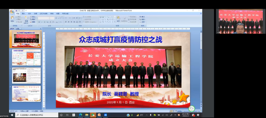 202211日,是学校抗疫第19天,也是新年第一天,运输所党支部多位教师与同学们一起召开“科学抗疫、奋发学习”主题班会,从学校抗疫政策解读、学生关怀、心理辅导等多个方面对学生进行专项指导,提升学生抗疫信心和学习主动性。