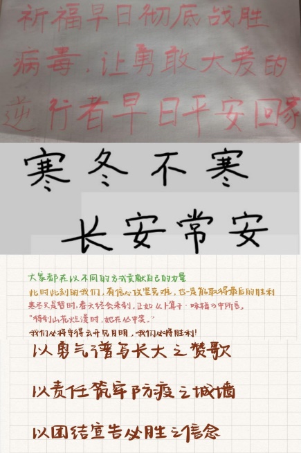 在学校、各级政府、全国人民的多重关护下,学生们乐观积极,已做好即将开展新学期学习的准备工作。正如同学们手写的抗疫祝福语:以勇气谱写长大之赞歌,以责任筑牢防疫之城墙,以团结宣告必胜之信念!待到春暖花开的季节,愿所求皆所愿,山河无恙,岁月安康!