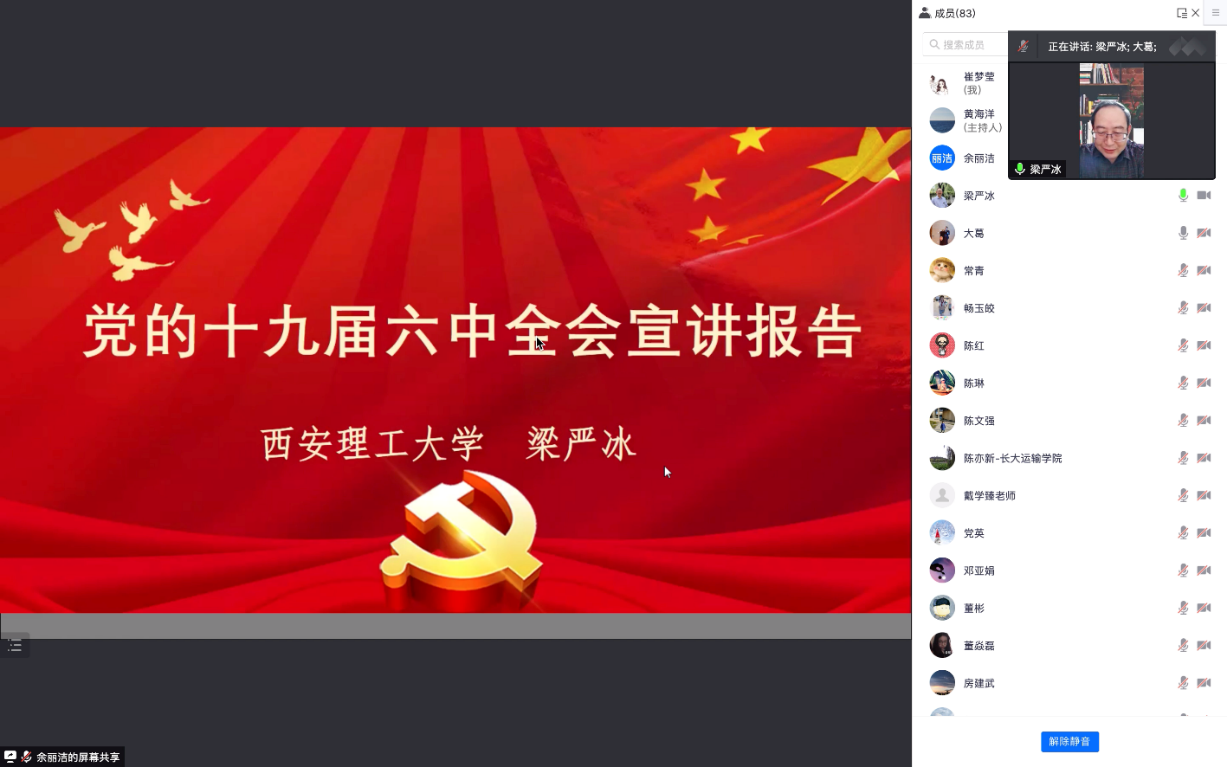 在线上举办党的十九届六中全会精神专题报告会暨学院党委理论学习中心组(扩大)学习会议,陕西省委学习贯彻党的十九届六中全会宣讲团成员、西安理工大学马克思主义学院院长梁严冰教授应邀来院作宣讲报告。学院全体院领导、全体教职工党员、本科生研究生各党支部支委共计130余人参加会议。报告会由学院院长葛颖恩主持。