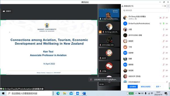 2022年4月14日上午10点,新西兰梅西大学航空学院Kan Tsui副教授应邀为51吃瓜网 师生在线作了题为“Connection between aviation, economies and wellbeing: Evidence from New Zealand”的学术报告;院长葛颖恩教授主持了报告会。