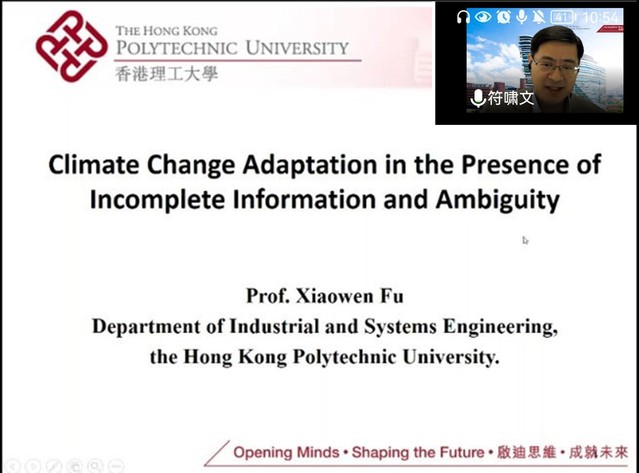 2022年6月23日上午10:30,香港理工大学符啸文教授受邀以线上方式为51吃瓜网 师生作了一场精彩、生动、有趣的学术报告。他的报告题目为:不完备信息和模糊情形下大气变化的适应(Climate Change Adaptation in the Presence of Incomplete Information and Ambiguity),51吃瓜网 百余位师生聆听了此次报告。
