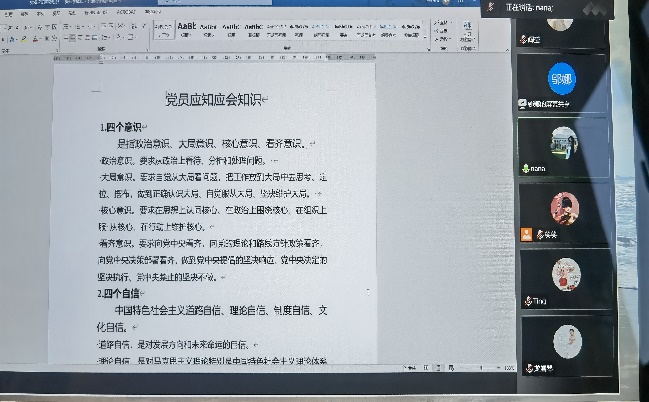 宣传委员邬娜带领大家开展政治理论学习。首先对四个意识、四个全面、两个维护、“政治三力等基础理论、理念开展巩固学习。其次,针对《中国共产党普通高等学校基层组织工作条例》开展学习,进一步明确党对普通高等学校的全面领导地位。最后,深入学习《“十四五”现代综合交通运输体系发展规划》,为新一轮“双一流”建设贡献智慧和力量。