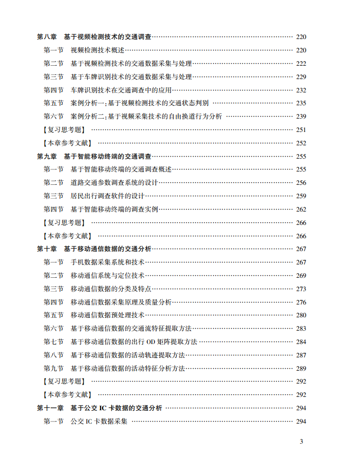 本教材结合国内外当前的新兴调查技术发展的实际情况,全面梳理了具有普适性的分析方法与数据处理技术,使本教材具有更广的适应性和更强的实用性,以满足社会各方面的要求。本教材系统梳理了交通调查的传统与新兴技术和成熟分析方法,尤其对基于浮动车技术的交通调查、基于地磁车辆检测技术的交通调查、基于视频检测技术的交通调查、基于智能移动终端的交通调查、基于移动通信数据的交通分析和基于公交IC卡数据的交通分析等内容进行了详细阐述。