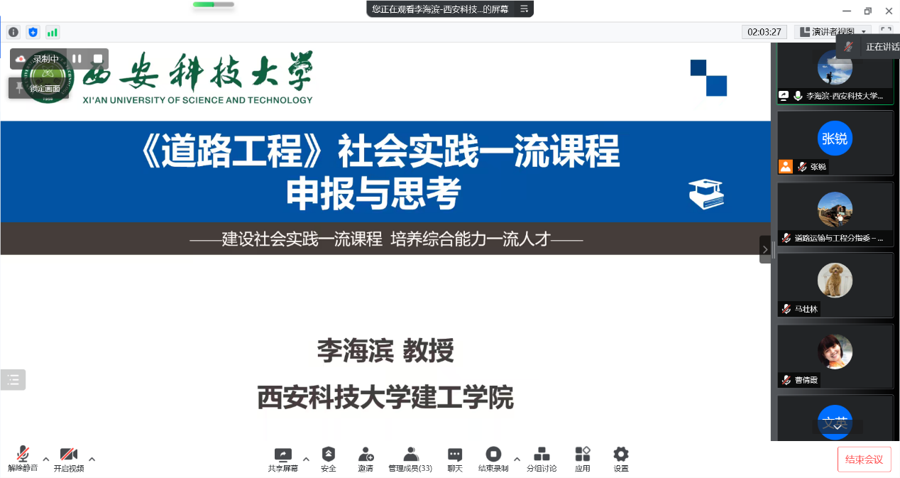 随后,来自吉林大学的刘宏飞教授、来自长沙理工大学的曹倩霞副教授以及来自西安科技大学的李海滨教授等三位第二批国家级一流本科课程建设负责人,分别围绕线下金课《汽车运用工程》、线上线下混合式金课《交通调查与分析》以及社会实践金课《道路工程》的建设过程,以线上会议形式向参会教师分享了自己在课程探索、课程思考、课程资源积累以及国家级“金课”申报等方面的经验与感受,并与参会教师进行了充分地沟通和交流。
