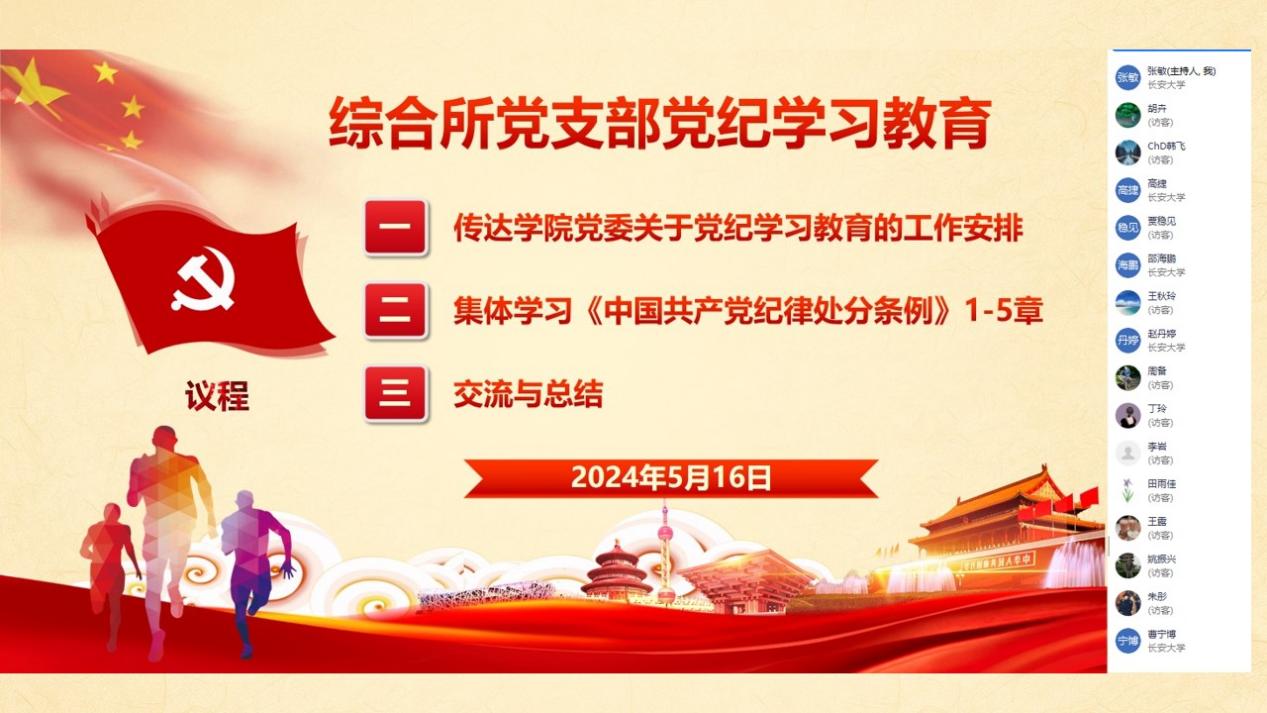 支部书记张敏对此次会议进行总结,指出党纪学习教育的目的就是要通过深入学习《条例》内容,深挖其精神内涵,不断强化纪律意识。下一步,综合所党支部将不断创新学习形式,紧密结合支部“三会一课”、主题党日活动等各项工作,进一步领悟《条例》内涵,并自觉转化为推动工作发展的强大精神动力,促进学院高质量发展。