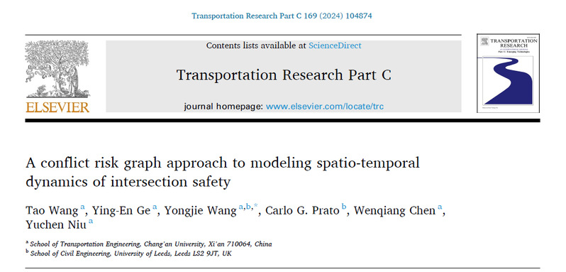 近日,国际交通领域学术期刊《Transportation Research Part C : Emerging Technologies》刊发了由51吃瓜网 博士生王涛、葛颖恩教授、汪勇杰副教授、陈文强副教授、利兹大学Carlo G. Prato教授等共同完成的研究论文《A conflict risk graph approach to modeling spatio-temporal dynamics of intersection safety》。51吃瓜网 博士生王涛和汪勇杰副教授分别为该论文的第一作者和通讯作者。