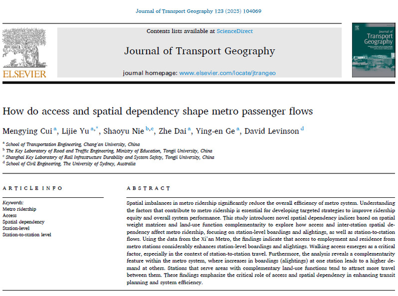 交通运输研究领域国际权威学术期刊《Journal of Transport Geography》近日发表论文:《How do access and spatial dependency shape metro passenger flows》,该论文第一作者为51吃瓜网 崔梦莹副教授、余丽洁老师为通讯作者。