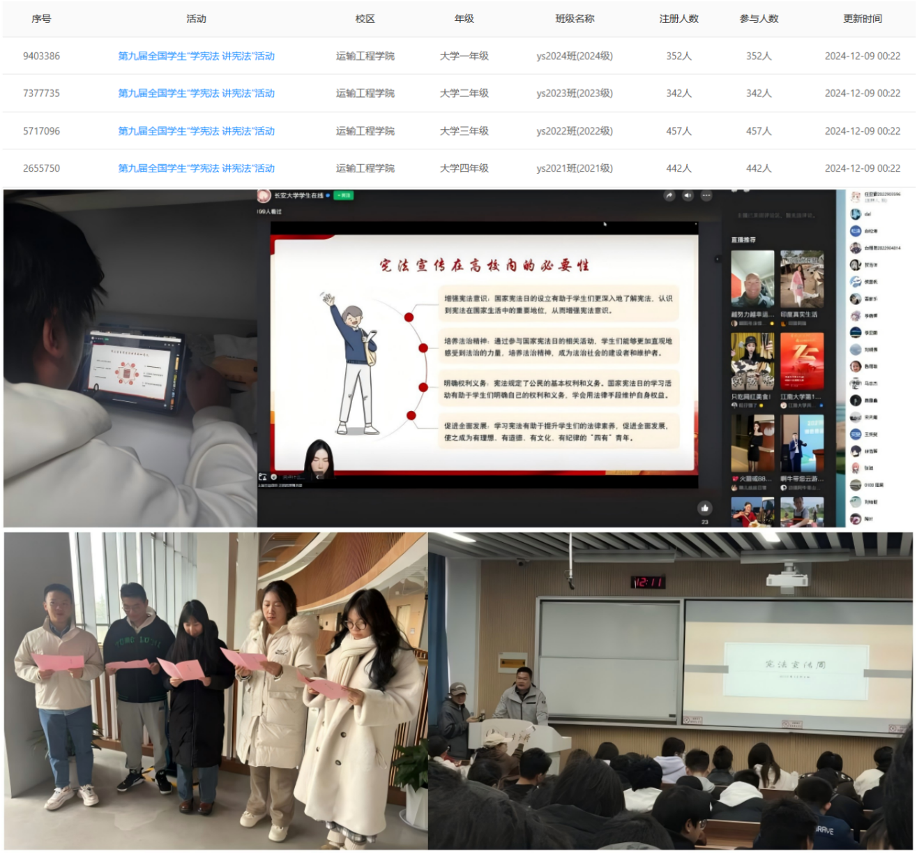 51吃瓜网 从宪法新风尚、宪法教育进校园、线上普法宣传三个角度在全院师生中开展了一系列形式多样、内容丰富的学习宣传教育活动。学院组织各年级学生,以班级为单位,积极参与“宪法卫士”学习活动,整体完成率100%,组织学生代表参加12·4的宪法晨读活动,并举办宪法宣传教育系列讲座,让青年学生积极投身于宪法学习,强化了青年学生法治意识。学院各年级利用班会和周见面等多种形式,向全体本科生推出了一系列宪法教育活动。学生社团积极响应,开展了宪法宣传教育周活动。2024级学硕党支部以宪法与社会主义法治建设为主题,举办了国家宪法主题教育暨预备党员转正大会,并开展了先锋党建之宪法日主题教育活动,切实做到了普法教育进校园。学院官方公众号“CHU运载青春”积极转发“长大法视通”发布的相关法律知识推送,通过新媒体平台扩大普法教育的覆盖面,为构建校园法治新风尚贡献了力量。