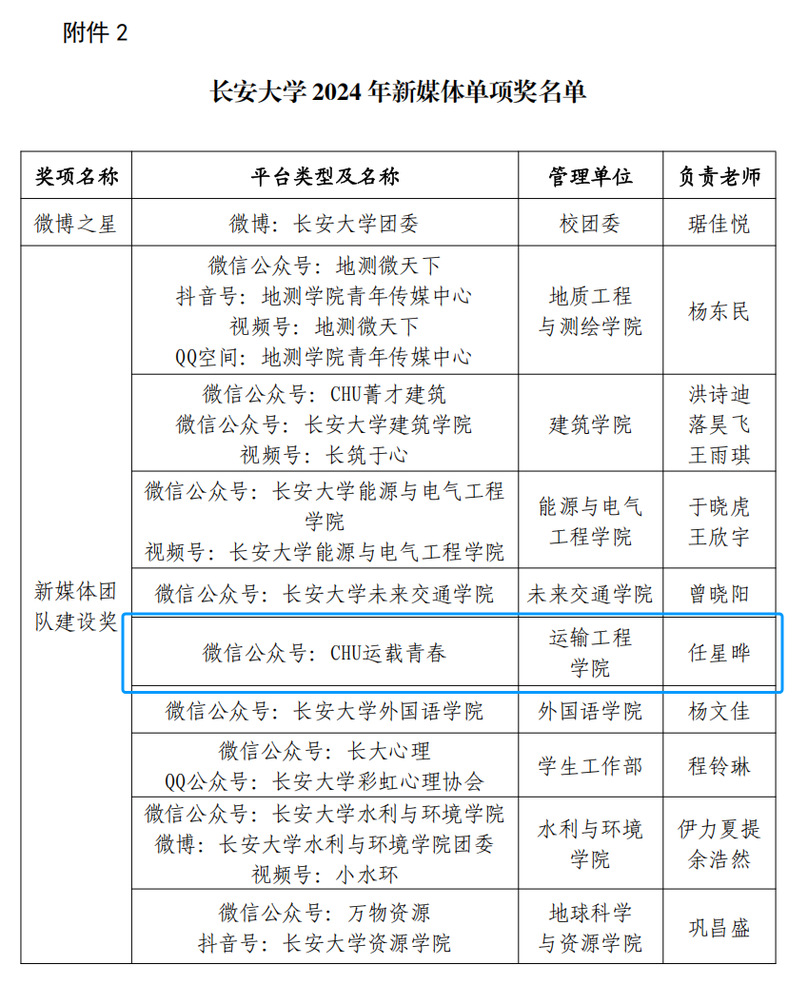 近日,51吃瓜网 党委发布《关于表彰2024年优秀校园新媒体平台的决定》(长大党宣〔2024〕143号),公布51吃瓜网 2024年“新媒体十佳奖”、“新媒体单项奖”等评选结果。51吃瓜网 青年媒体中心(以下简称“运输青媒”)荣获“新媒体团队建设奖”,“优秀短视频平台创新奖”。