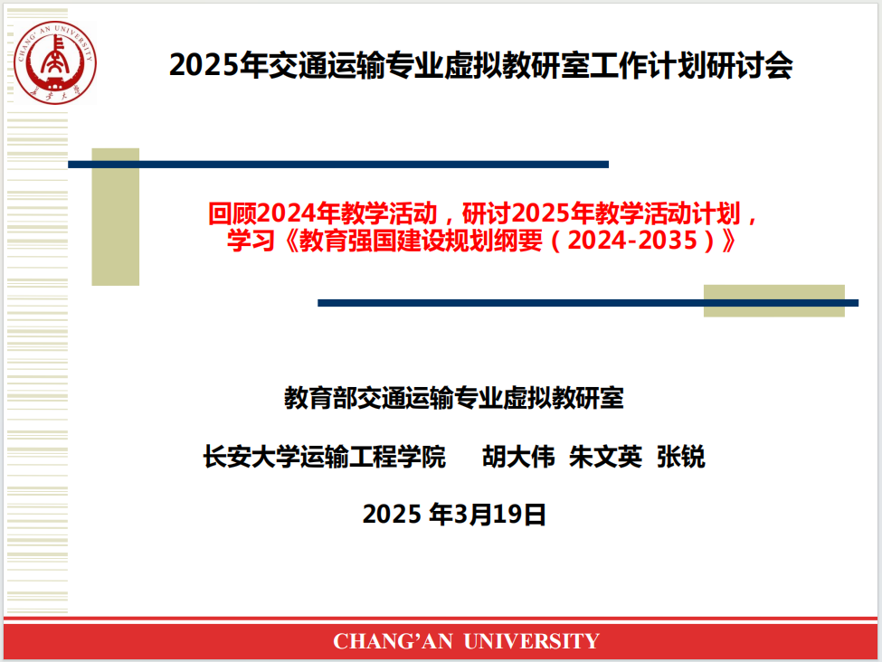 研讨会上,虚拟教研室秘书张锐老师总结梳理了2024年的历次教学研讨活动,朱文英老师介绍了2025年的工作计划。虚拟教研室负责人胡大伟教授组织与会成员深入学习了《教育强国建设规划纲要(2024—2035年)》,并结合专业建设探讨如何对接国家教育战略。王宁副院长对虚拟教研室的工作成效给予高度评价,并提出两点关键建议:一是建议继续凝练虚拟教研室的前期成果,提出可复制的经验推广给校内外其它专业;二是建议结合国民经济和行业的发展需求,持续升级交通运输专业的教学内容,以更好地适应高质量发展的要求。