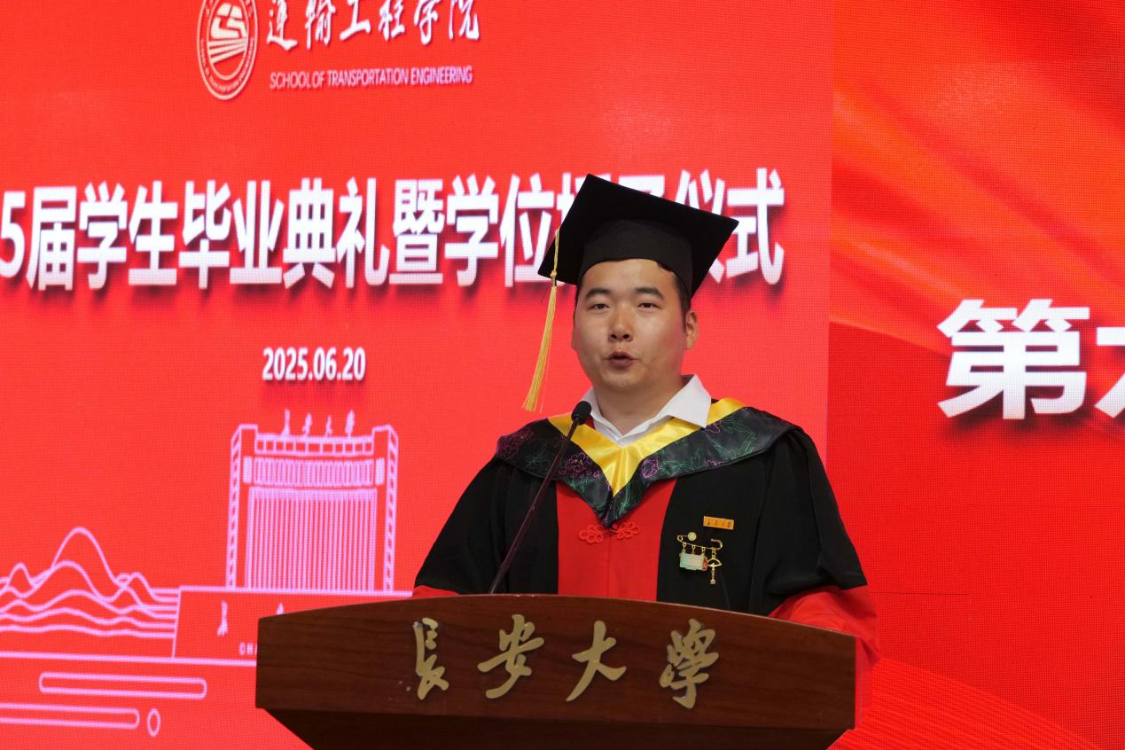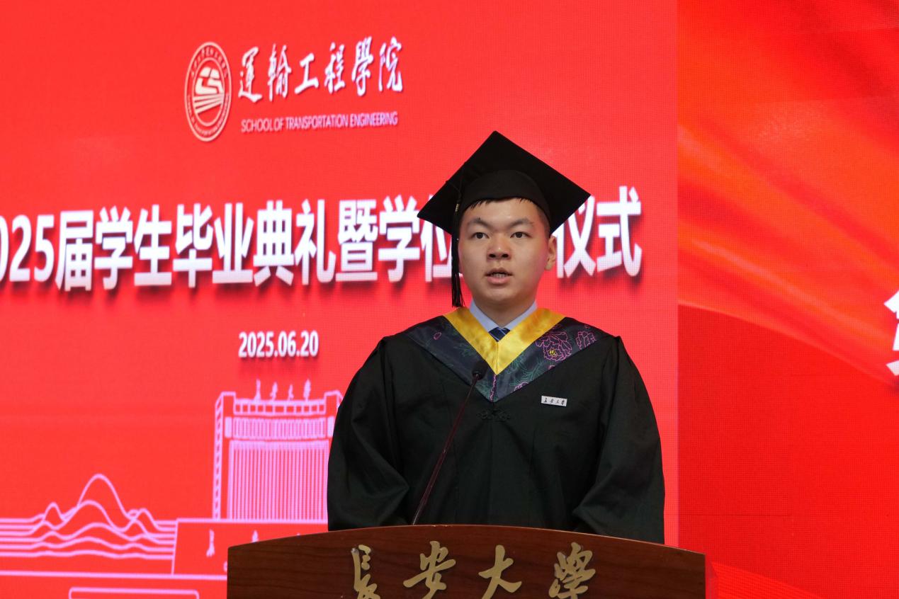 研究生毕业生代表崔亮斌表示,感谢母校和学院各位老师们的倾心付出,未来将以“奔赴山海”的豪情,以更饱满的热情和更坚定的信念,迎接未来的挑战和机遇,为社会发展进步和交通强国建设贡献力量!
