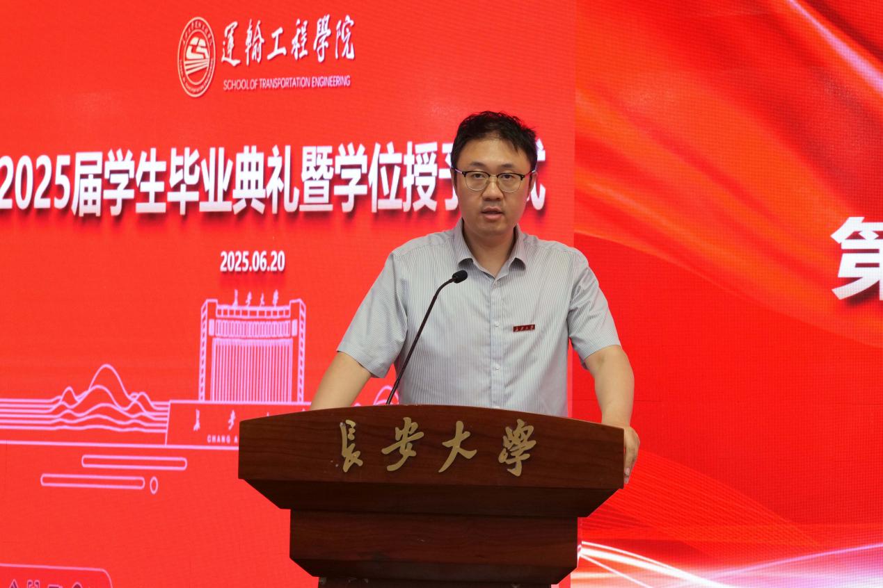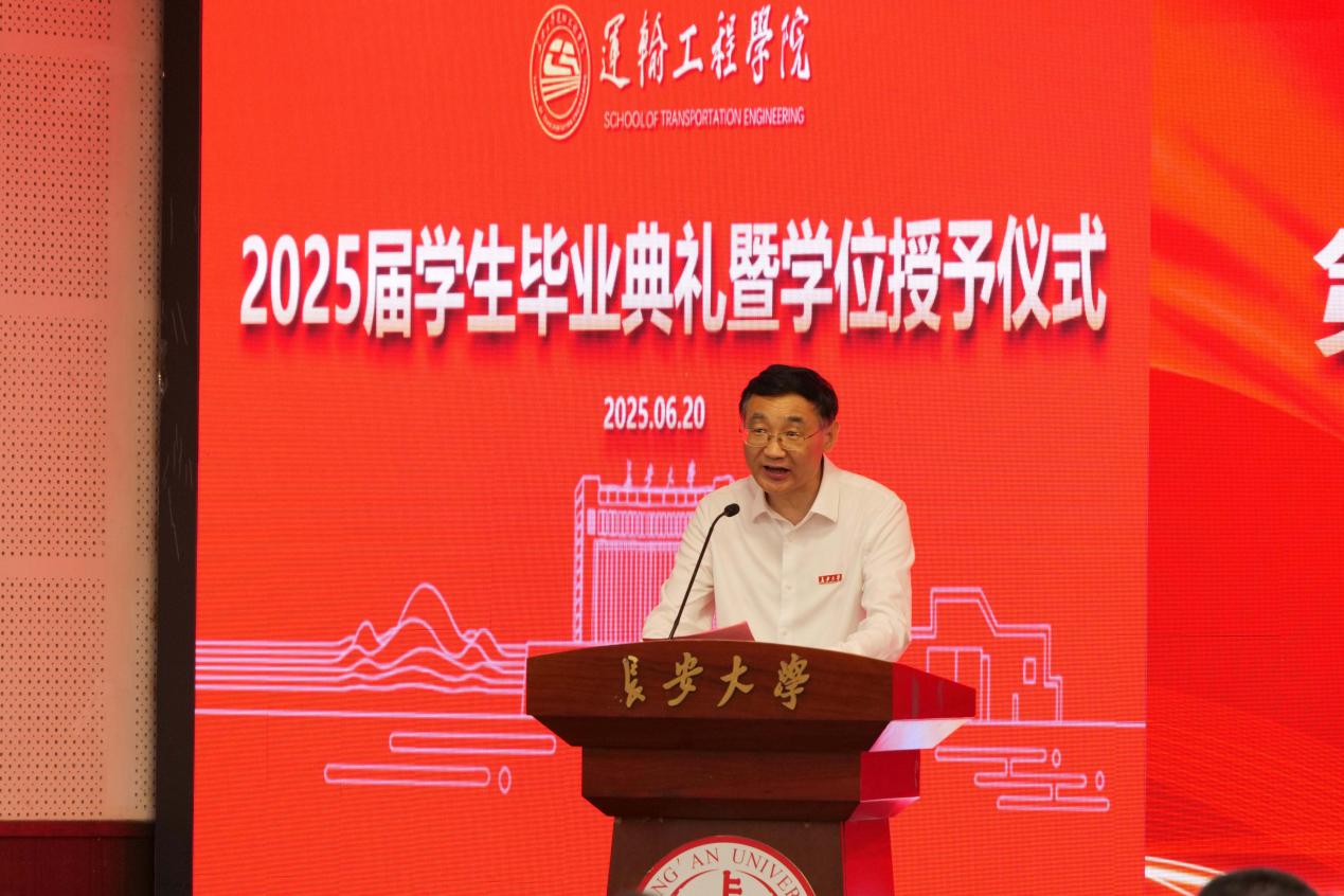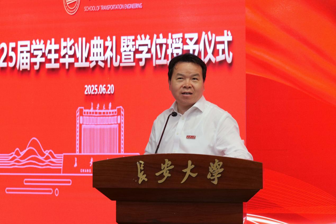 陶继东向圆满完成学业的全体毕业生表示祝贺,向一路陪伴、支持学子成长成才的家长和师长表示感谢。他强调“青年兴则国家兴,青年强则国家强”,作为新时代的青年,肩负着历史的重任和时代的使命,为此他提出三点希望:一是要以“胸怀家国”锚定人生航向,勇担时代使命。以“强国建设、民族复兴”为己任,将个人奋斗的“小我”融入国家发展的“大我”,用实际行动诠释新时代青年的责任与担当。二是要以“厚积薄发”锤炼过硬本领,砥砺奋进之志。在“十四五”收官之年,希望同学们以“功成不必在我,功成必定有我”的担当,在交通运输现代化建设中勇当先锋。三是要以“敢为人先”开拓未来疆域,厚植家国情怀。希望同学们永葆交通人“逢山开路、遇水架桥”的开拓精神,涵养“大道至简、实干为要”的朴实品格。以德立身、以诚待人,做交通文明的传播者。